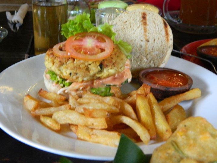 Kita pesen banyak makanan, mulai dari Burger Tempe, Omelet bayam, Tempe Mendoan, Soup juga (Gue lupa pesenan si Nopal yang mirip zupa-zupa itu), Jus Wortel, Milk Tea dll.